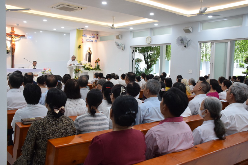 Trong phần chia sẻ Lời Chúa, cha Giuse Phạm Anh Quốc, giáo sư Đại Chủng viện Thánh Giuse Xuân Lộc, đã giúp cộng đoàn chiêm ngắm lại dung mạo hiền lành, khiêm tốn và đầy lòng mến Chúa của Thánh Martino. Theo ngài, điều làm nên sự thánh thiện nơi Martino không phải là những việc phi thường, mà chính là TÌNH YÊU được thể hiện trong từng cử chỉ nhỏ bé hằng ngày. Trong tâm tình đó, Cha Giuse cũng mời gọi cộng đoàn học nơi Thánh nhân “biết yêu và mở lòng đón nhận tình yêu”. Đi sâu vào ý nghĩa của tình yêu Kitô giáo, Cha Giuse diễn giải rằng yêu “đúng như Chúa muốn” chính là biết cảm thông, biết nâng đỡ anh chị em. Ngài trích dẫn lời Thánh Phaolô để định nghĩa về một tình yêu đích thực, đó là một tình yêu “không ghen tương, không vênh vang, không tựđắc, không làm điều bất chính, không tìm tư lợi, không nóng giận, không nuôi hận thù, không mừng khi thấy sự gian ác, nhưng vui khi thấy điều chân thật. Đức mến tha thứ tất cả, tin tưởng tất cả, hy vọng tất cả, chịu đựng tất cả” (x.1Cr 13). Khi biết yêu thương đúng như Chúa dạy, con người cũng tìm thấy hạnh phúc đích thực của mình, hạnh phúc không đến từ thành công hay của cải, mà chính là niềm vui được thuộc về Thiên Chúa, được hưởng hạnh phúc Nước Trời.