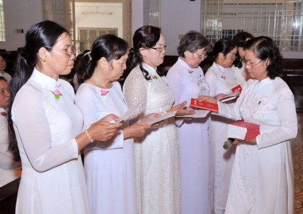 Đầu lễ, cha mời gọi mọi người cầu nguyện cho 10 anh chị em mới gia nhập, 1 chị tuyên khấn lần đầu, 7 anh chị khấn vĩnh viễn luôn biết tôn thờ Thiên Chúa, yêu mến Đức Mẹ, bảo vệ Hội Thánh, loan báo Tin Mừng, sống khiêm nhường, bác ái để ngày sau được hưởng Nước Trời như Mẹ.