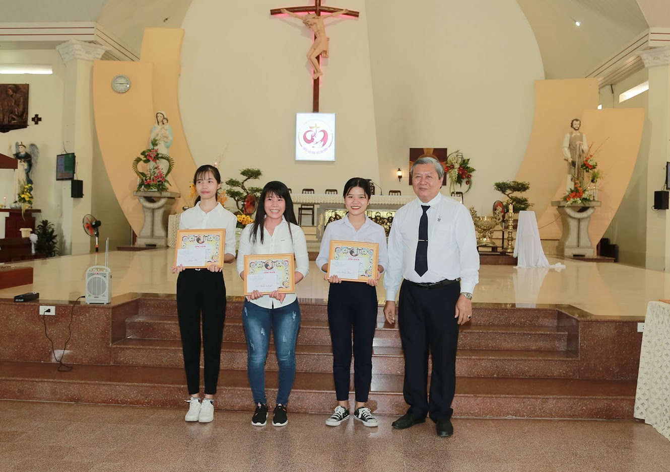 Tiếp đến là phát bằng tri ân các vị ân nhân của giáo phận và liên huynh, những đoàn viên có công đóng  góp và hoàn thành xuất sắc nhiệm vụ trong năm 2018, đồng thời khen thưởng các em giới trẻ đã đạt thành tích học tập tốt trong năm qua. Kết quả hoc tập của các em giới trẻ đạt thành tích cao gồm có :Giải nhất thuộc về em Maria Vũ Thị Duyệt – HĐ Long Hương.  Giải nhì em Maria Trần Thị Ngọc Quế – HĐ Ngọc Hà. Giải ba thuộc về em Maria Phan Thị Hoa – HĐ Châu Pha. Và giải nhất học tập đồng đội đã thuộc về tập thể giới trẻ Huynh Đoàn Ngọc Hà.