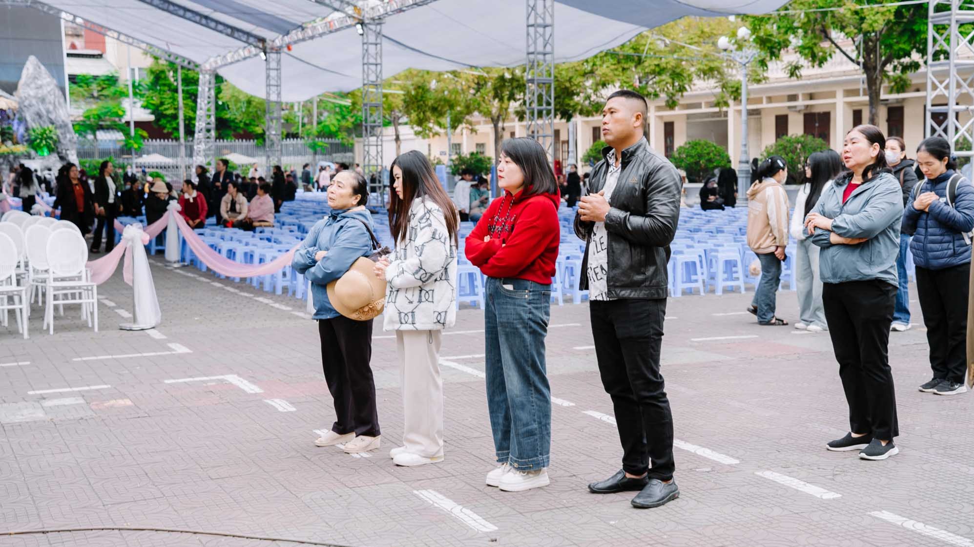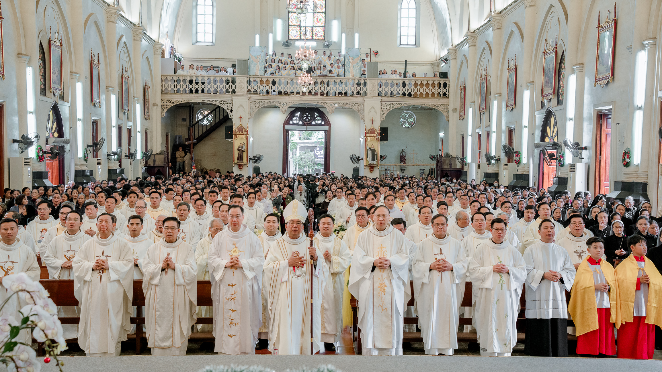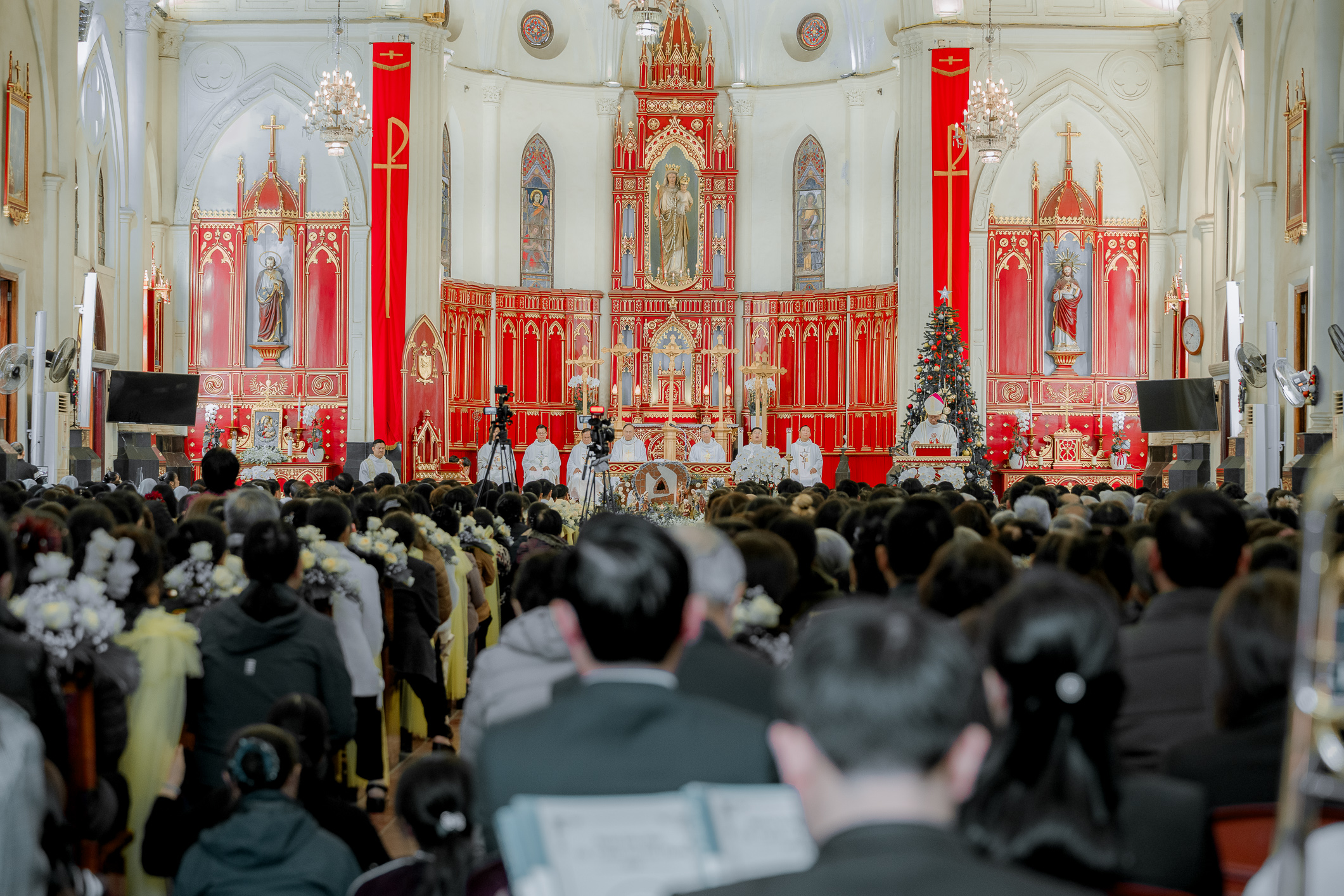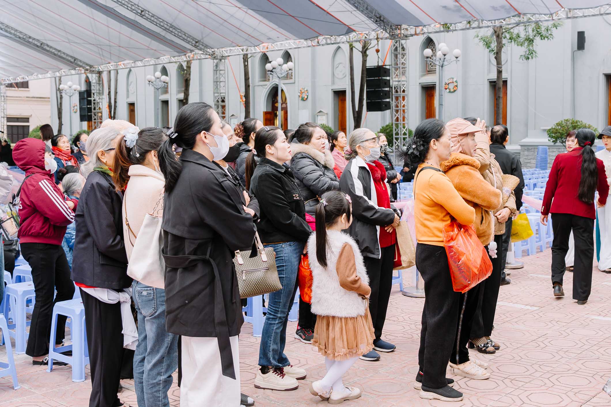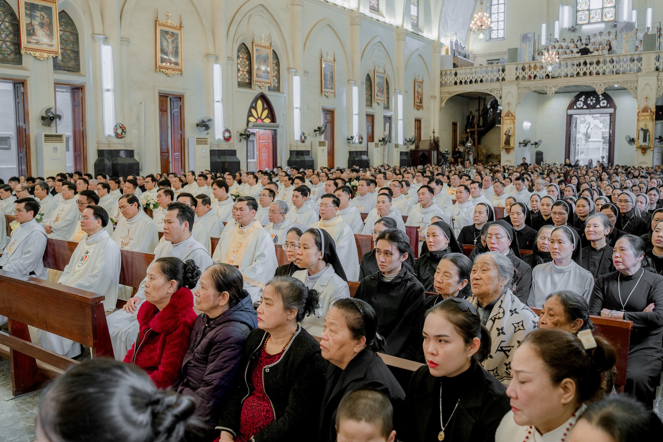 Ngay từ sáng sớm, từng đoàn người, từng đoàn xe nối tiếp nhau đã tấp nập quy tụ về nhà thờ Chính Tòa. Không chỉ là những cộng đoàn ở gần, mà cả các giáo xứ xa xôi như Trà Cổ, Móng Cái, Ninh Dương – cách Tòa Giám mục hơn 200km – cũng đã hiện diện từ rất sớm, không quản ngại quãng đường dài và giờ giấc di chuyển để trở về với Giáo phận. Tất cả cùng gặp nhau trong bầu khí hân hoan, chan chứa niềm vui mừng và hy vọng, hiệp thông trong ngày lễ trọng đại này.