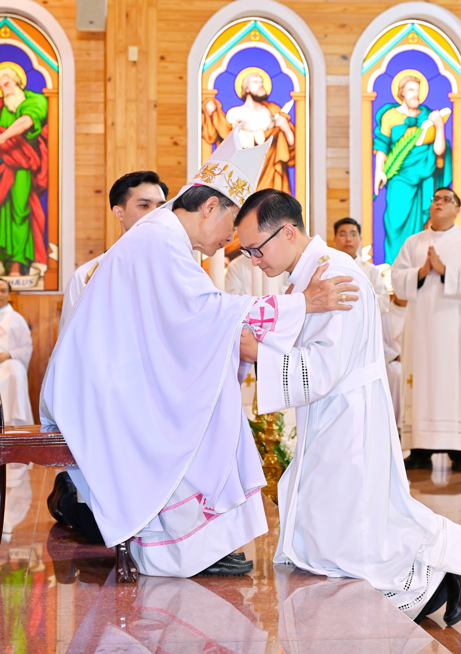 Sau lời nguyện truyền chức, Đức cha trao dây phó tế và sách Tin Mừng cho từng tân chức, với lời nhắn nhủ: “Con hãy tin điều con đọc, dạy điều con tin và thi hành điều con dạy.” Nghi thức kết thúc với cử chỉ trao hôn bình an giữa Đức cha và các tân phó tế, cũng như giữa các phó tế hiện diện trong Thánh lễ. Cộng đoàn tiếp tục bước vào Phụng vụ Thánh Thể trong bầu khí trang nghiêm và sốt sắng.