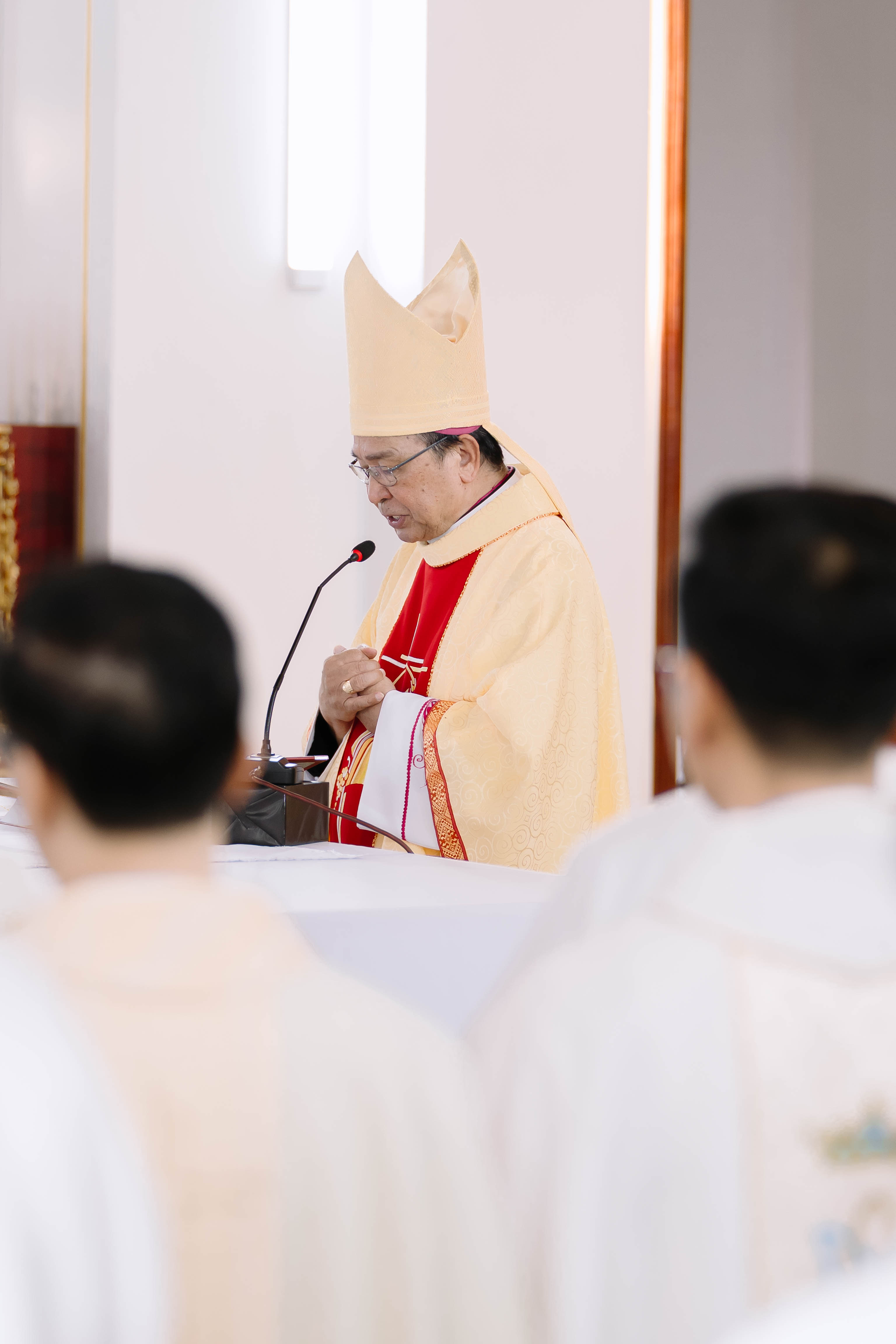Mở đầu Thánh lễ, Đức TGM Giuse còn nhấn mạnh đến ngày thứ Năm Tuần Thánh – ngày mà Chúa Giêsu trong bữa Tiệc ly đã lập Bí tích Thánh Thể và chức Linh mục để tiếp tục thông ban Mình và Máu Thánh Người cho đoàn chiên cho đến ngày tận thế. Ngài mời gọi cộng đoàn cầu nguyện và cộng tác với quý Cha, đồng thời đón nhận quý Cha với tất cả khả năng Chúa ban cũng như những mỏng giòn yếu đuối của phận người.