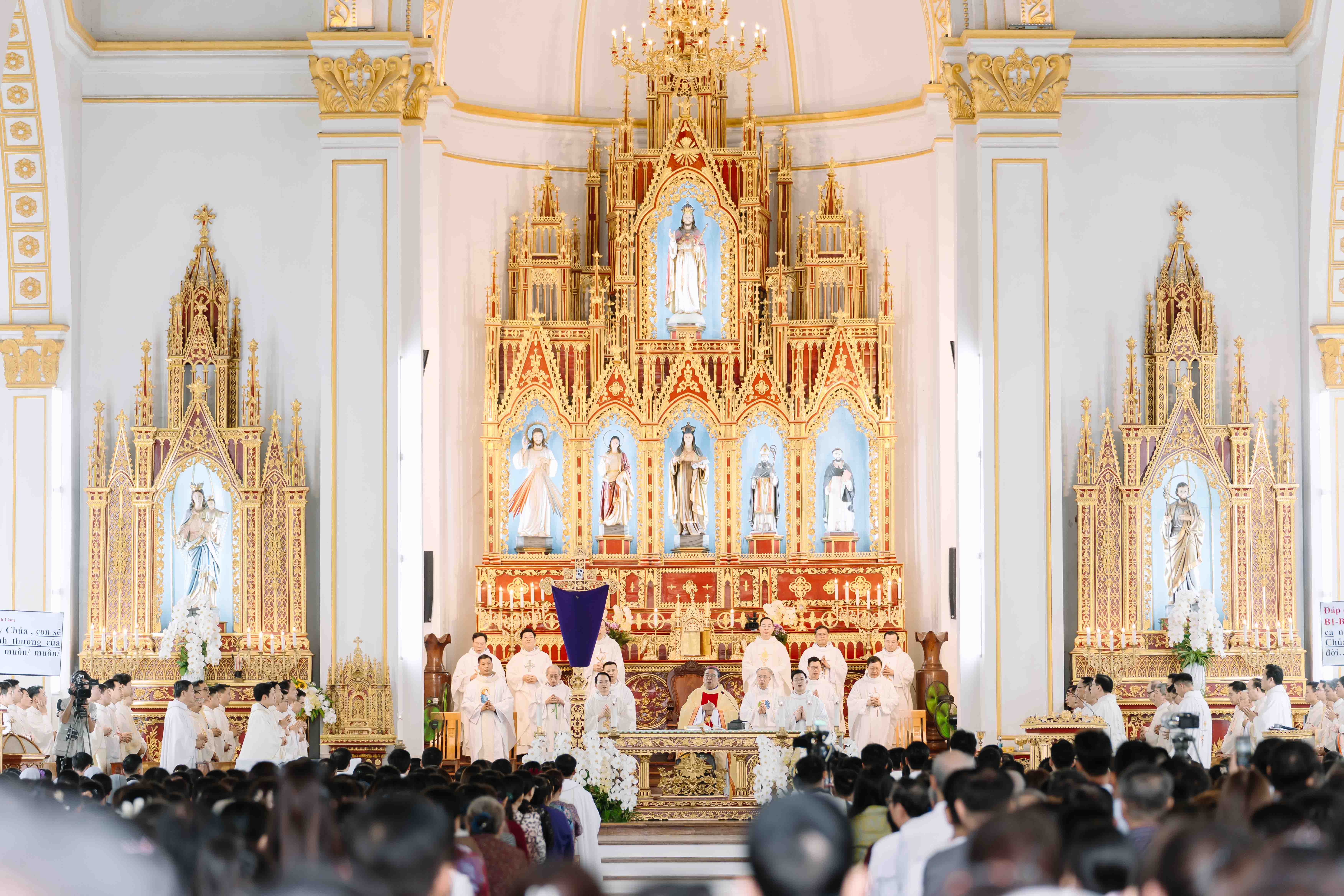 Cao điểm của ngày đại lễ là Thánh lễ do Đức Cha Tôma chủ tế. Cùng đồng tế với ngài có hầu hết quý Cha trong Giáo phận. Thánh lễ cũng có sự hiện diện sốt sắng của quý Phó tế, quý Tu sĩ nam nữ, quý Chủng sinh, và khoảng hơn 50.000 bà con giáo dân từ khắp nơi. Tất cả làm nên một bức tranh thật đẹp về tinh thần hiệp thông trong Giáo hội, nơi mọi con cái Chúa được chính Chúa quy tụ, cùng quây quần bên Bàn tiệc cực thánh mà Thiên Chúa thiết đãi dân Ngài.