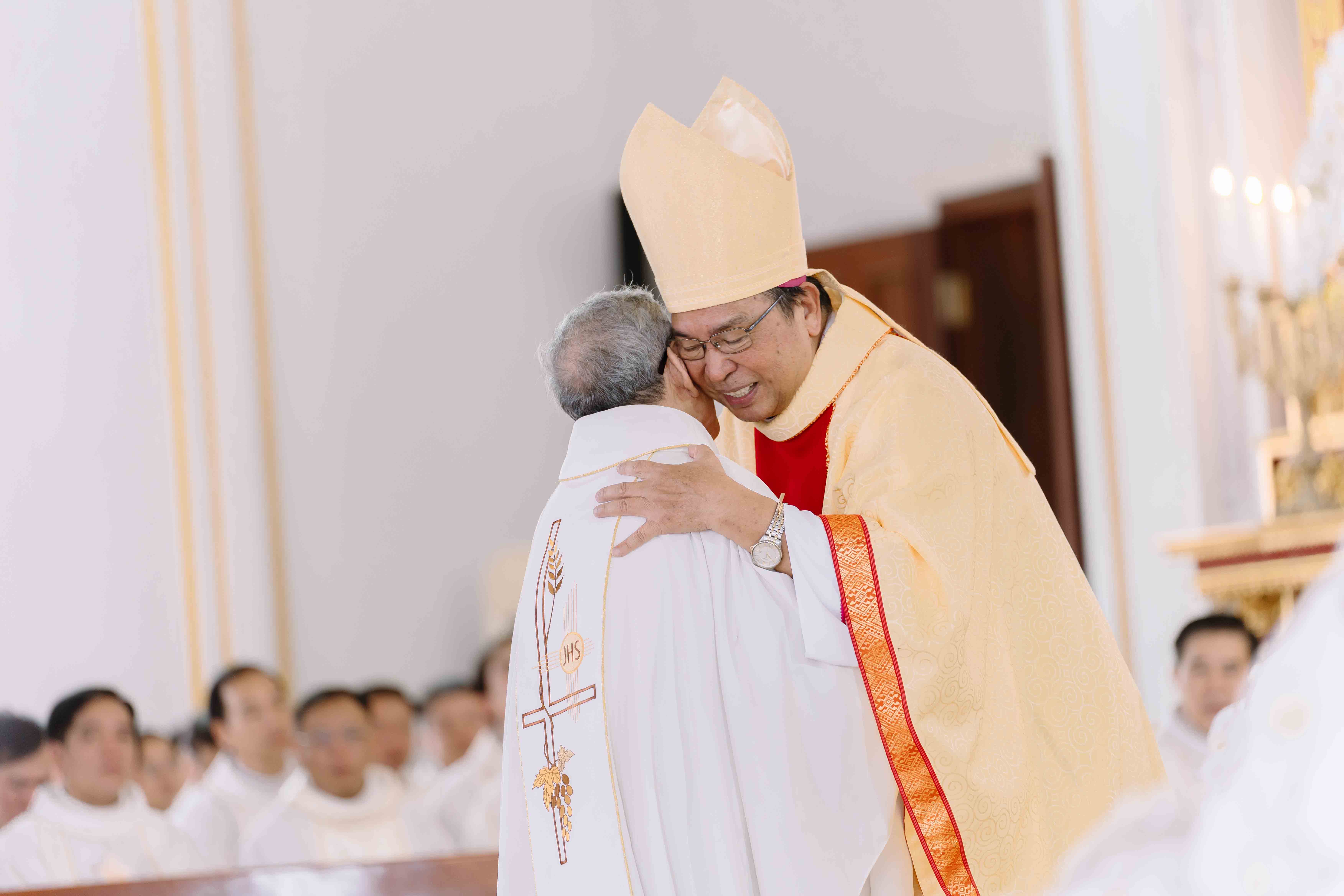 Sau phần bài giảng, linh mục đoàn cùng nhau lặp lại lời tuyên hứa của ngày chịu chức và Đức cha trao bình an cho tất các các linh mục.